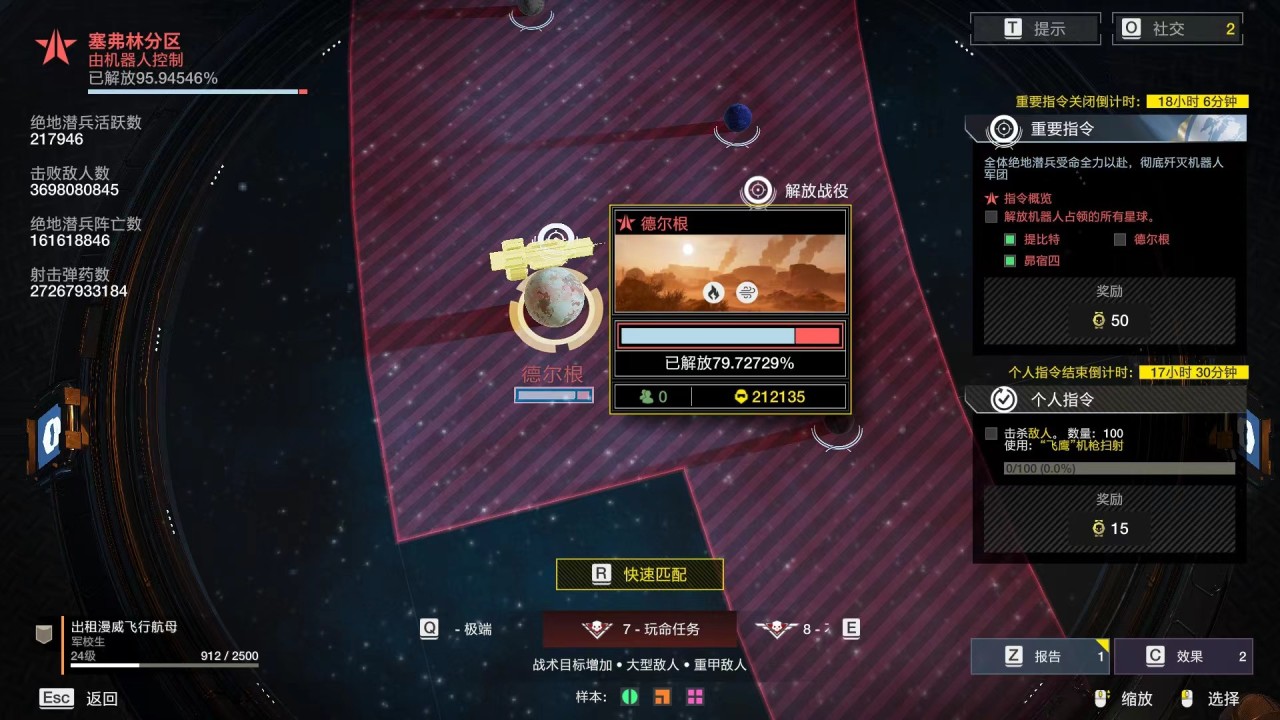 北京时间2024年4月8日凌晨3点,在全球玩家的努力下,机器人势力已经在游戏中被全球玩家彻底抹杀绝地潜兵2!谁能想到比虫族个体能力强那么多的机器人会在虫族之前被抹杀。祝贺宇宙地图上的超级地球机器人,也祝贺世界各地千千绝地潜水员的数百万玩家。是你们的血汗造就了世界的辽阔,日月星辰是可以学习的。